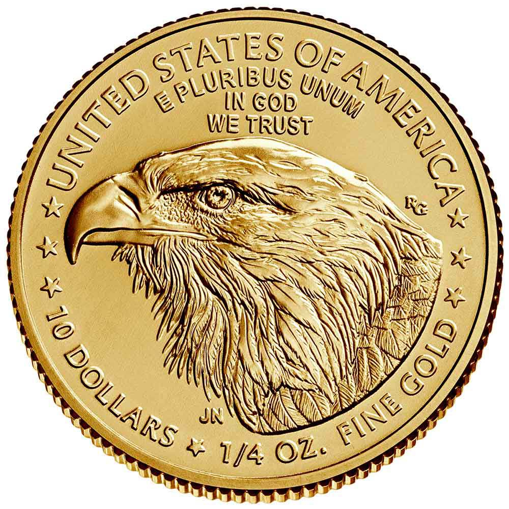 For the reverse of 1/4 oz. Gold American Eagle coin, the US Mint features one of two possible designs. From 1986 to mid-2021, the US mint featured Miley Busiek’s depiction of a family of bald eagles in and around the nest. As of mid-2021, to commemorate the American Eagle’s 35th anniversary, the coins now feature Jennie Norris’ image of the head of a bald eagle in left-profile relief. The new design incorporates security features for heightened assurance.