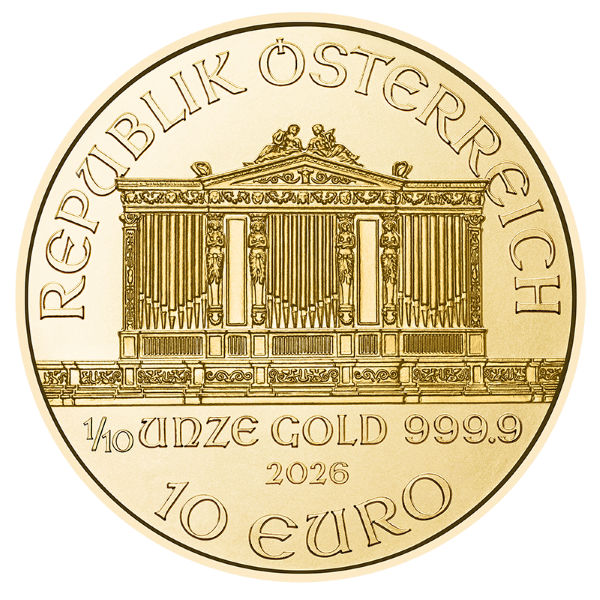 Each 2026 1/10 oz Gold Austrian Philharmonic coin carries a €10 Euro face value backed by the Republic of Austria, providing sovereign assurance of the coin’s gold content, weight, and authenticity.